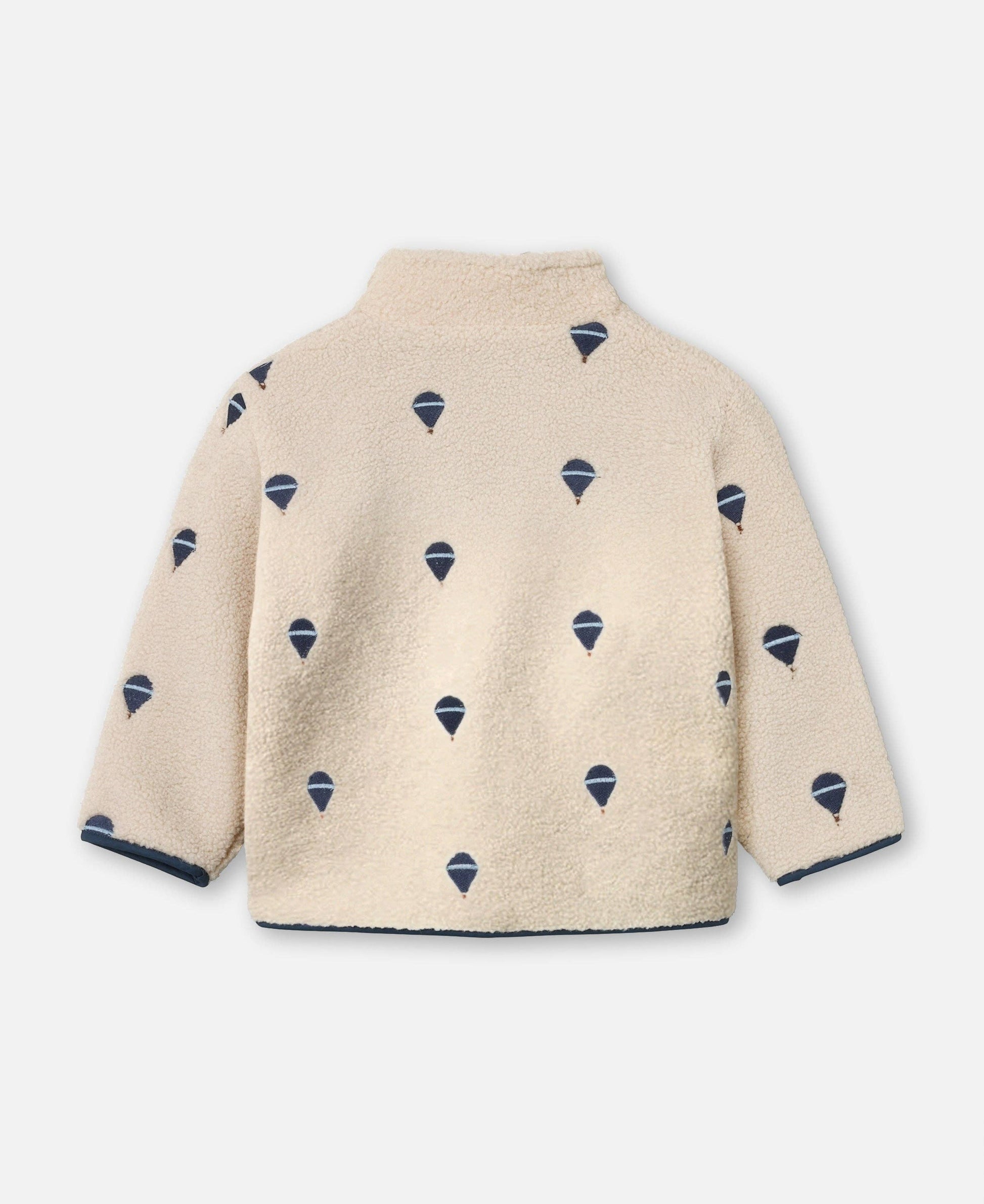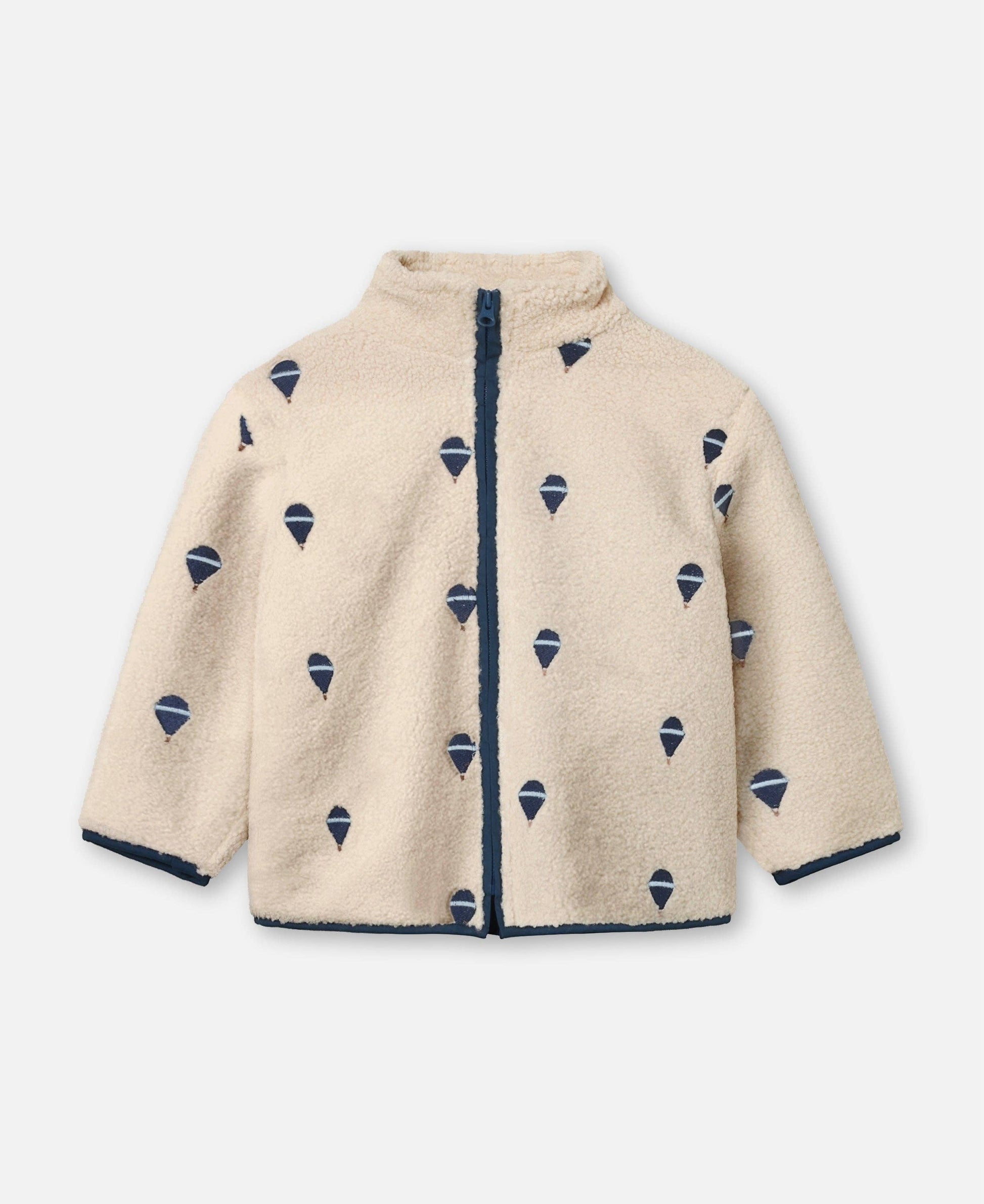 Cool jacket with a soft teddy with hot air balloon embroidery. The jacket has a high collar, zip and long sleeves. The jacket has side pockets.