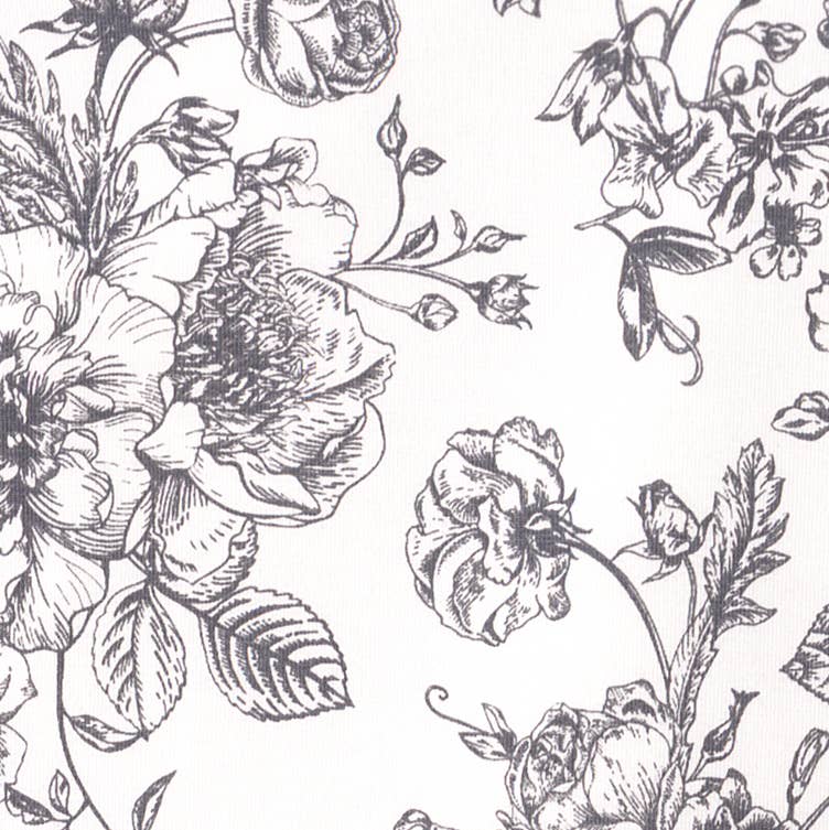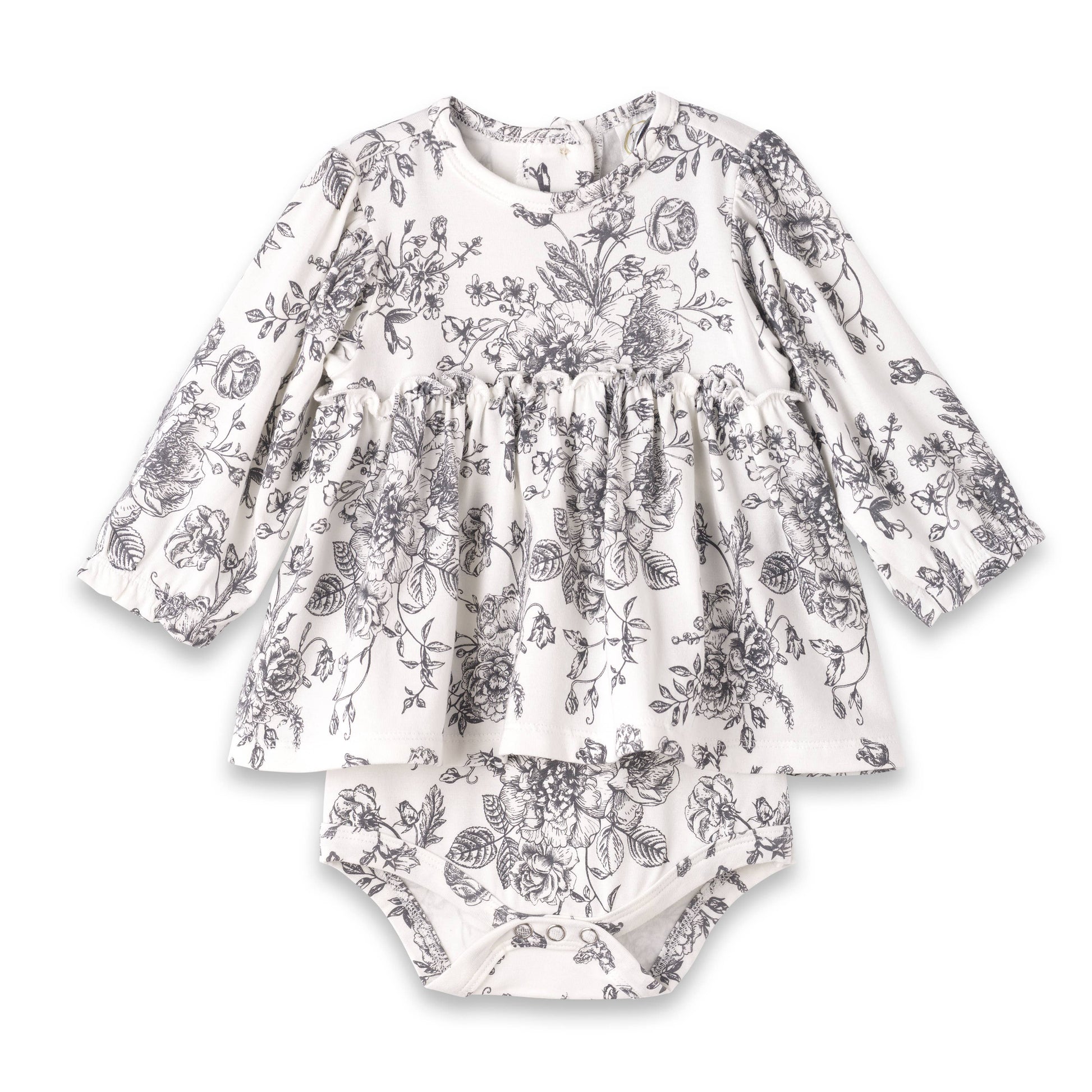This sweet skirted bodysuit features a classic grey floral toile print. Made from an ultra-soft bamboo-spandex blend, it's eco-friendly and hypoallergenic.