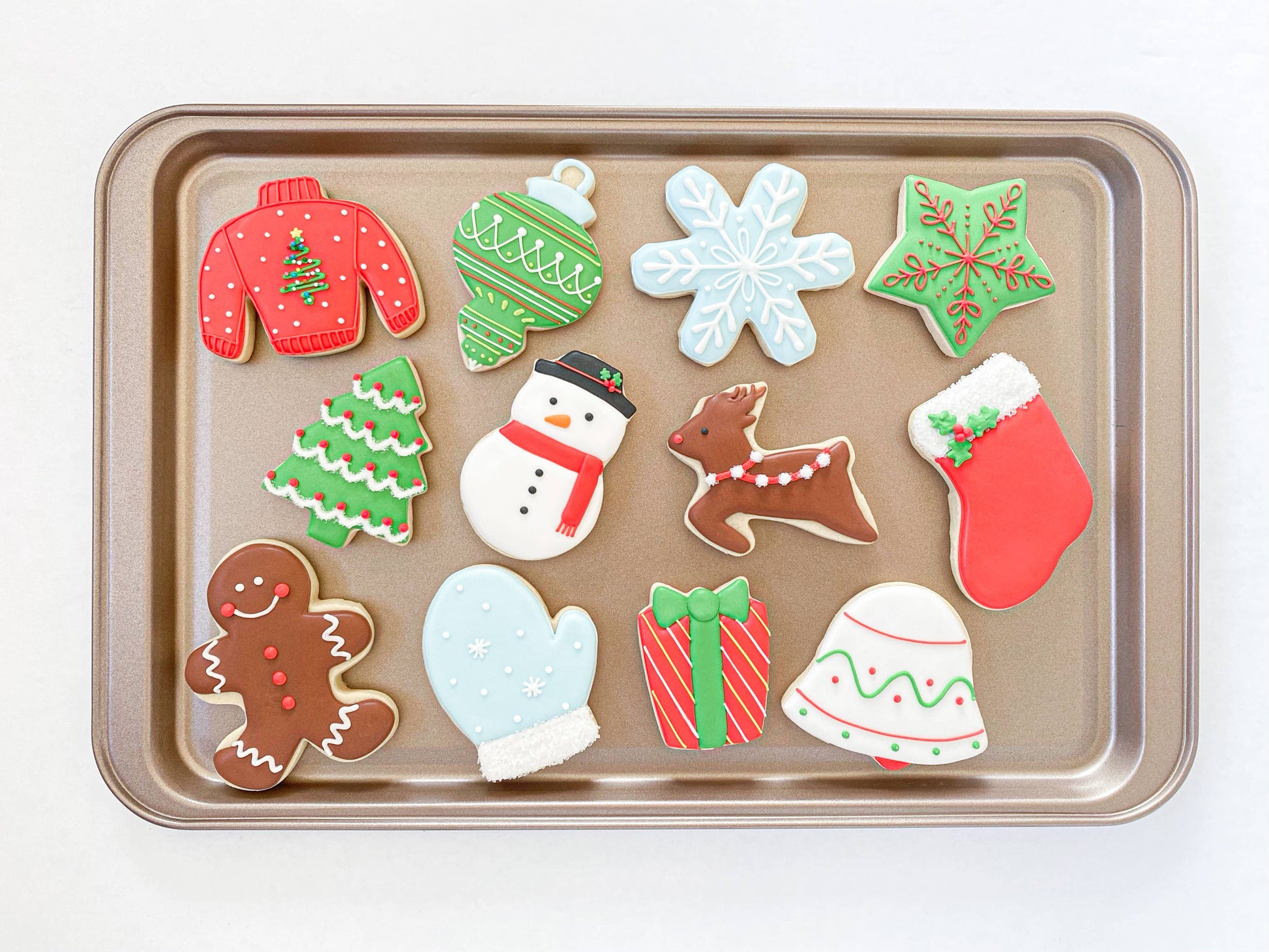 - 12 stainless steel cookie cutters (sweater, reindeer, star, mitten, gingerbread man, gift, ornament, bell, stocking, snowman, snowflake, Christmas tree)