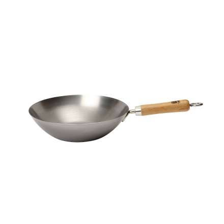 This wok comes with a bamboo screw in handle and the School of Wok logo burnt into the handle. The thickness of the gauge is 1.2mm.