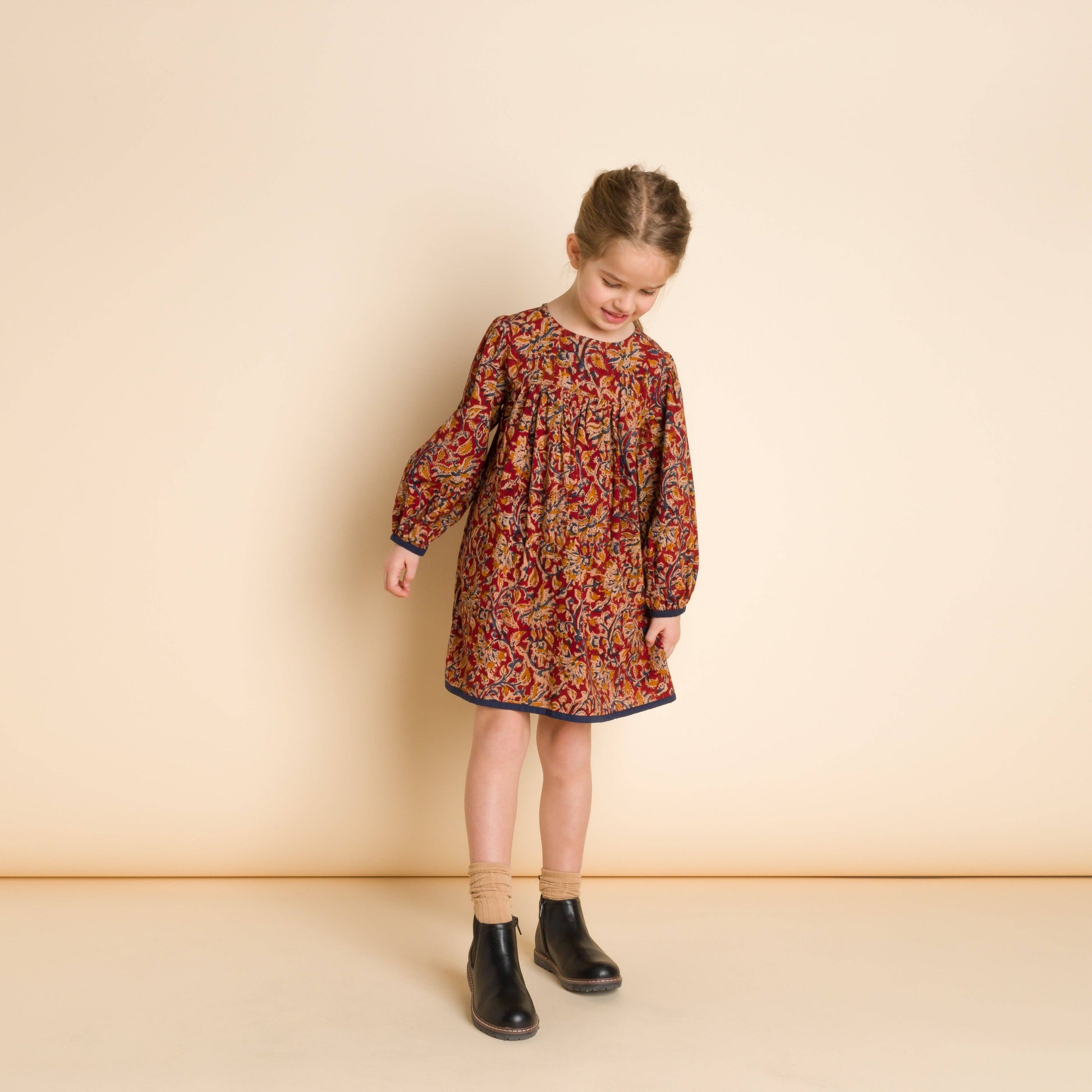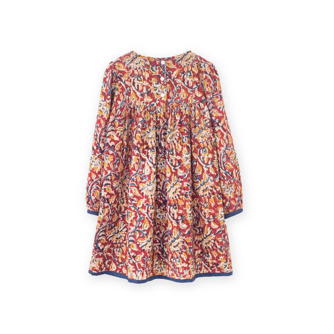 The dress is available in our rich red hand block print on a jacquard fabric.